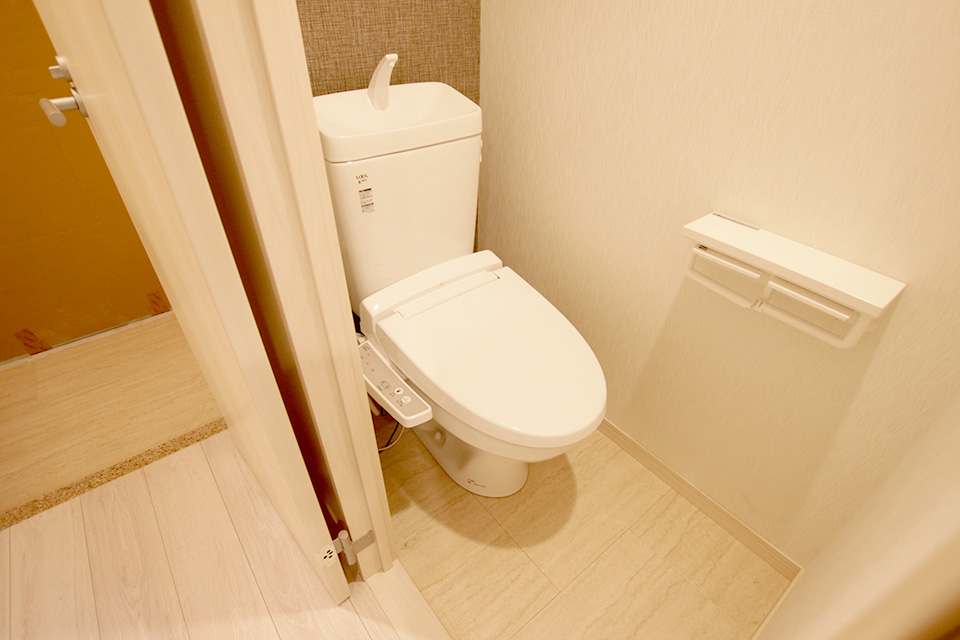 | トイレ | 温水洗浄便座付きトイレ・ペーパーホルダー・タオル掛け・上部棚付き・間接照明 | |||