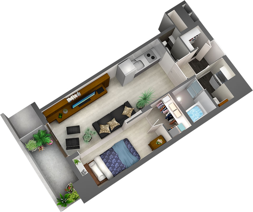 洋室7.1帖の1Kです。女性に人気が高いオフホワイトを基調としたデザインで、清潔感漂う明るいお部屋です。全居室のパウダールームにデザイン化粧台を採用し、気品を纏うおしゃれな仕上がりとなっています。